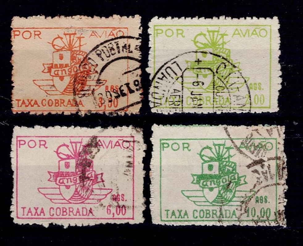 484 imageAngola 1947 Air Mail Ctt Emblem. Set of 4 stamps Mf#CA11+13+15+17 of 2, 3.50, 6 and 10 Angolares. Used copies with good color and irregular perforation normal in these stamps. Catalog value € 239 .(Image 1)