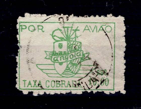 485 imageAngola 1947 Air Mail Ctt Emblem. Stamp Mf#CA17 of 10 Angolares green blue, smooth to dotted paper, perforation 11. Used copy with good color and irregular perforation normal for these stamps. Catalog value € 175.(Image 1)