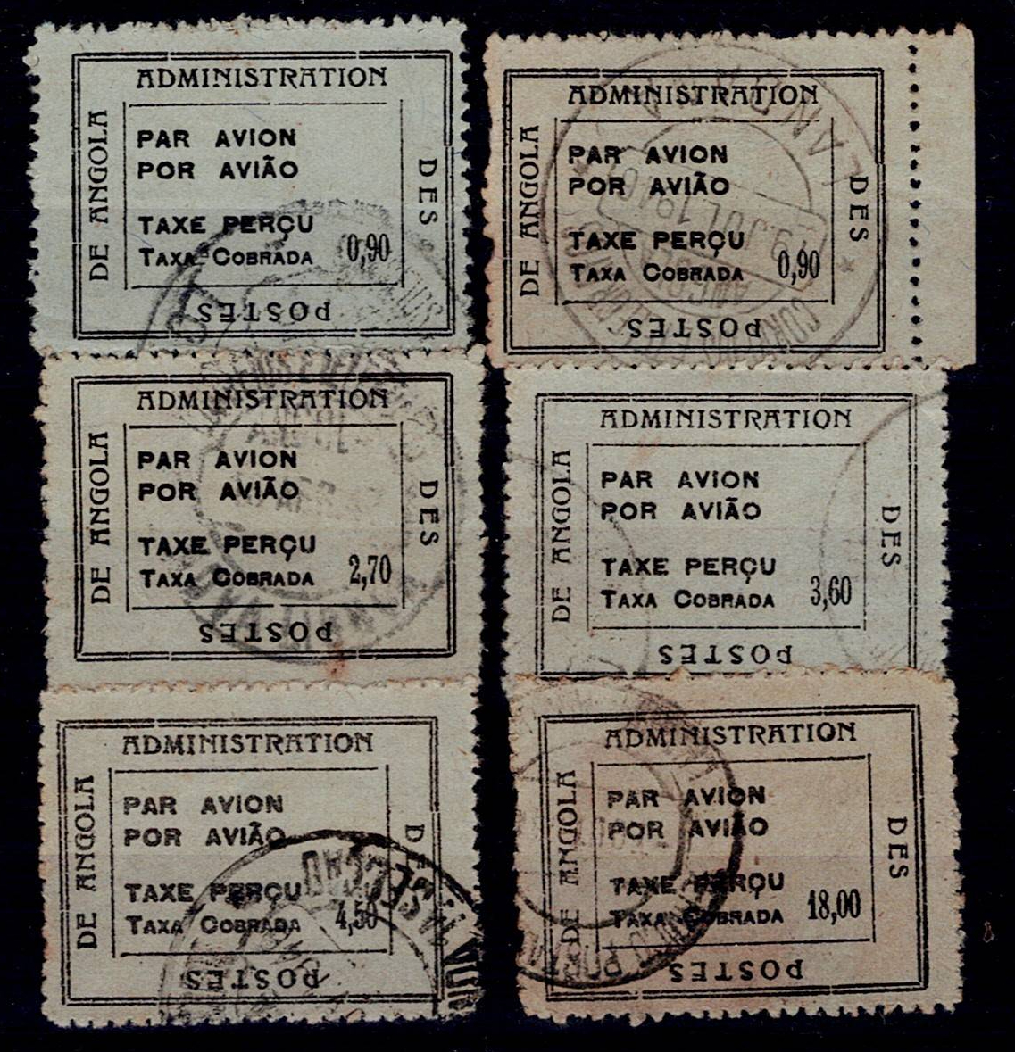 486 imageAngola 1945 Airmail Surcharge, legend "taxe perçu / fee charged". Set of 6 labels on smooth blue paper, with the values ​​2 x 0.90 + 2.70 + 3.60 + 4.50 + 18.00. Used copies, in good color, with some minor defects. Catalog value € 89.(Image 1)