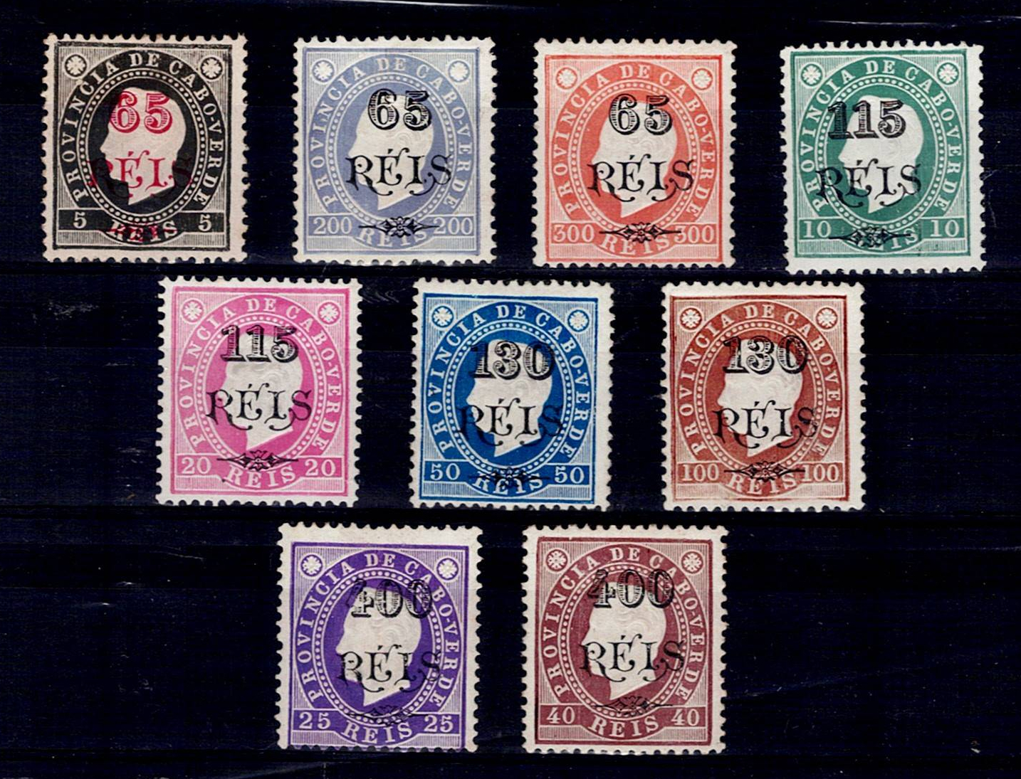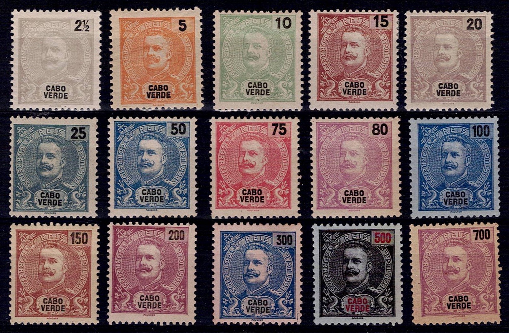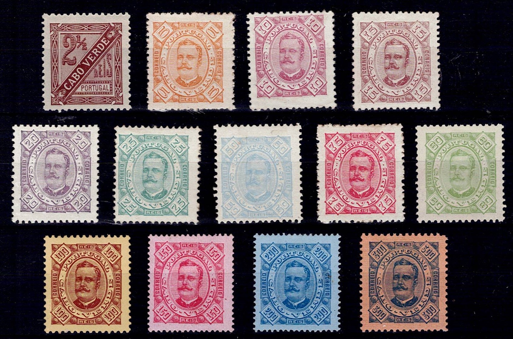 511 imageCape Verde 1893-95 – D. Carlos I, Diogo Neto type. Complete series of 13 stamps Mf#24-36, from 2.5 to 200 reis, on plain paper or porcelain. New stamps, with gum and hinge, without defects or repairs, in good color. Catalog value €300.(Image 1)