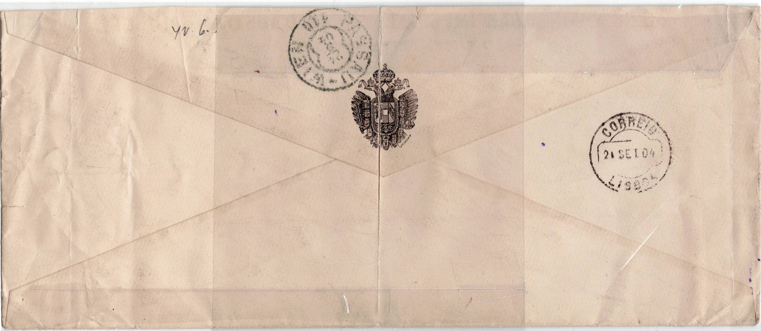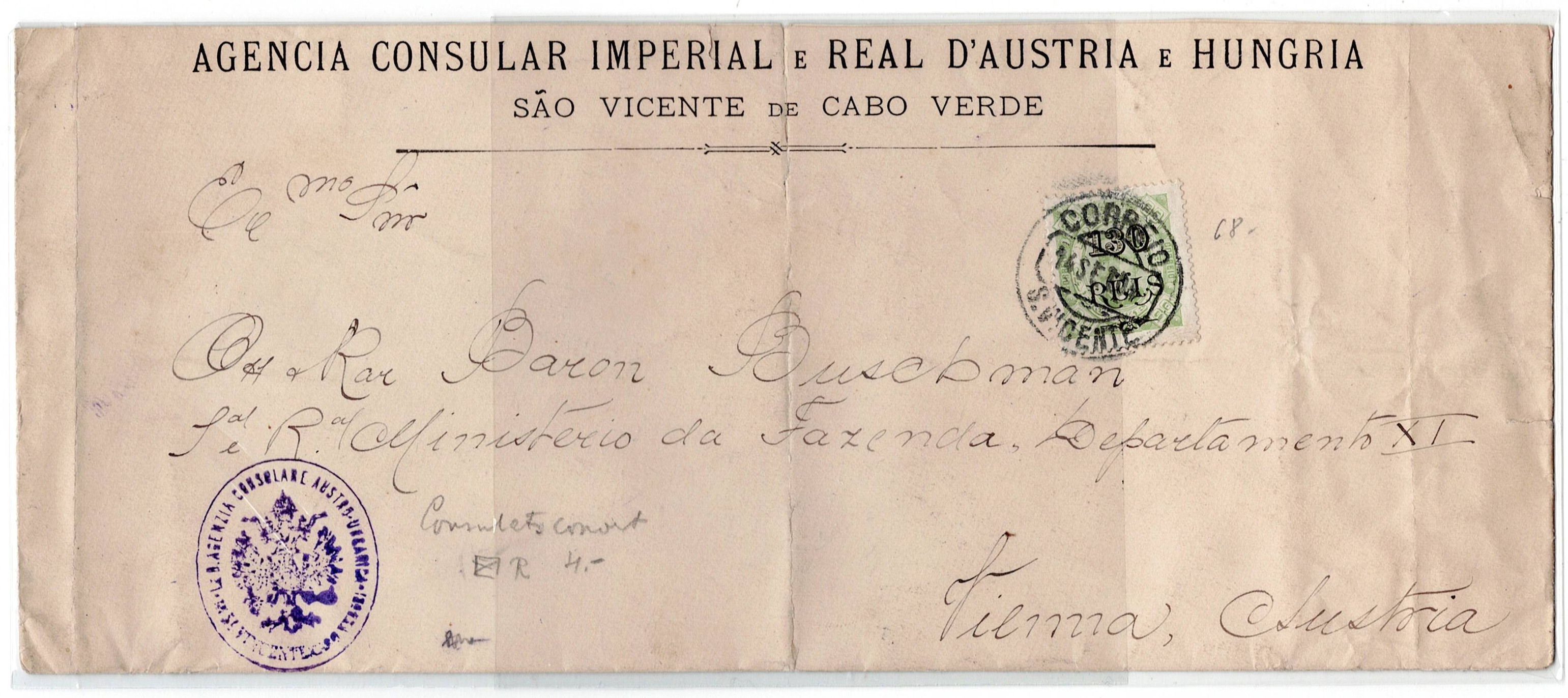 514 imageCape Verde. Large envelope, sent from São Vicente on 14 September 1904, postage of 130 reis (130/80 stamp), sent by the Imperial German Consulate, via Lisbon 21 September, arrival in Vienna on 24 September. Very rare 130/80 stamp on letter(Image 1) (Image 2)
