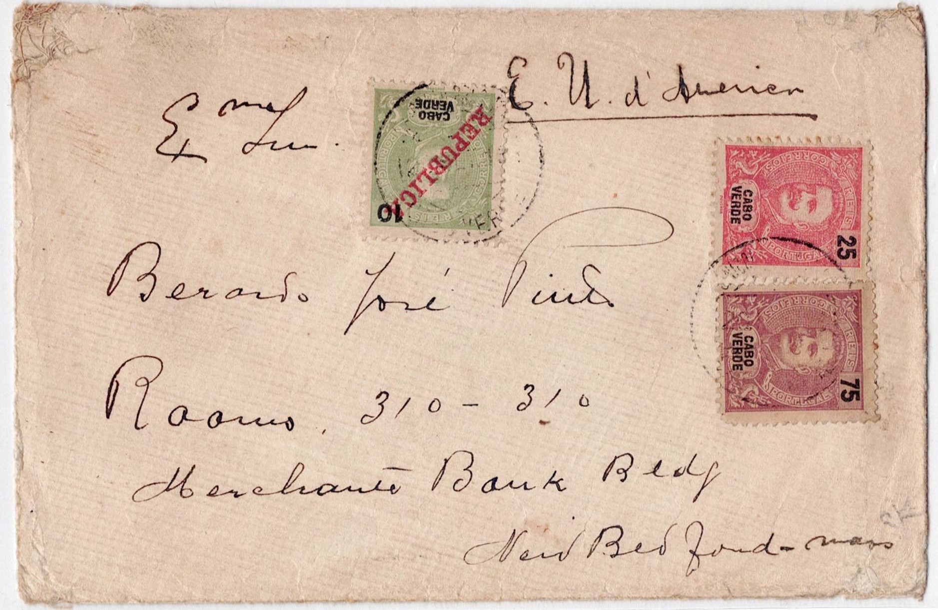 516 imageCape Verde 1903 D. Carlos Mouchon, new colors and values ​​with Republic overprint. Cover circulated from S. Vicente (22 September 1913) to New Bradford, USA with 2 stamps of 25 and 75 reis Mf#78+81 plus a stamp of 10 reis with SC Republic Mf#88.(Image 1)