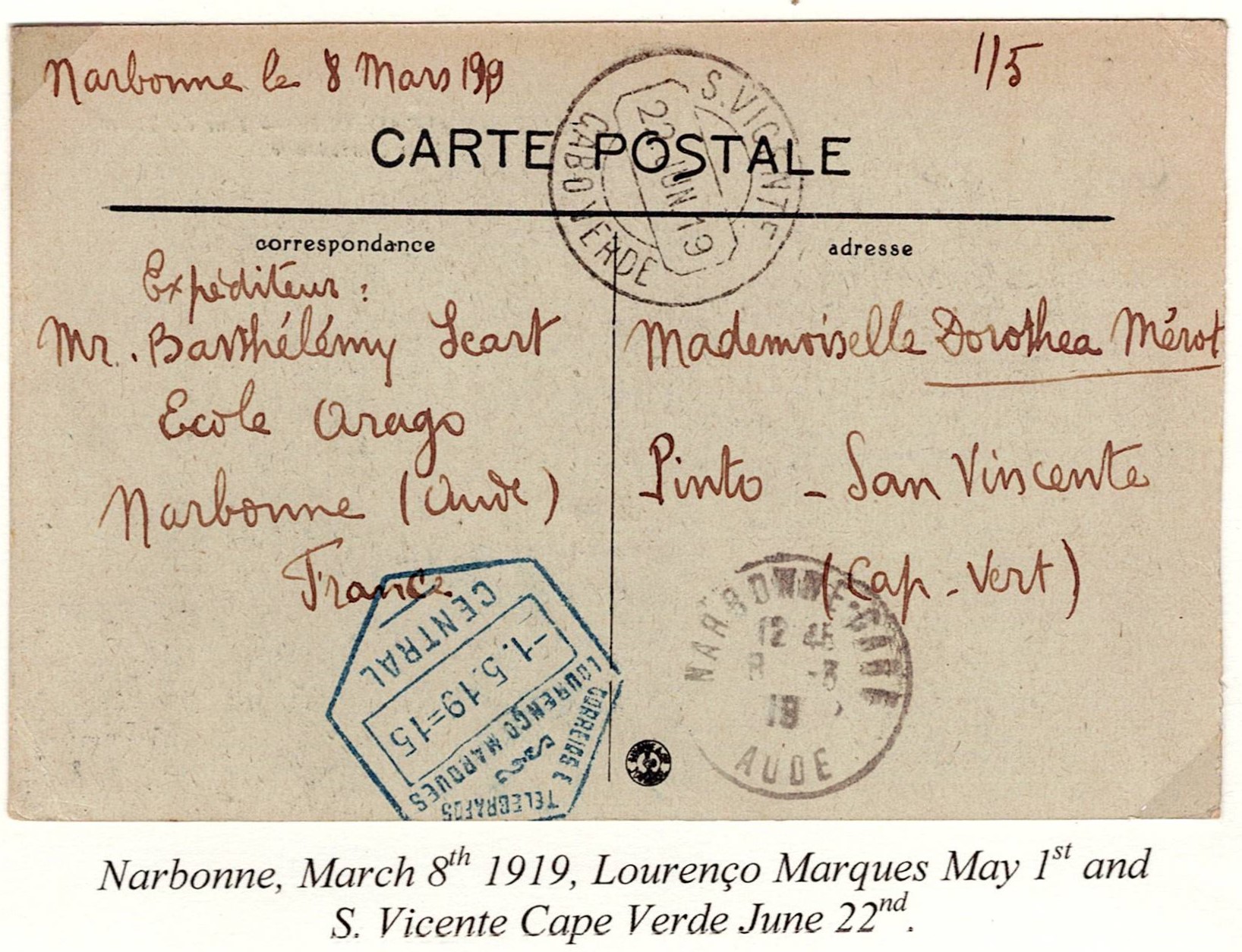 521 imageCape Verde. Illustrated postcard from Narbonne, France, addressed to São Vicente de Cabo Verde and written on March 8, 1918. It was sent to Lourenço Marques, where it arrived on May 1, 1919, and finally to São Vicente on June 22, in a transit period of over a year.(Image 1)