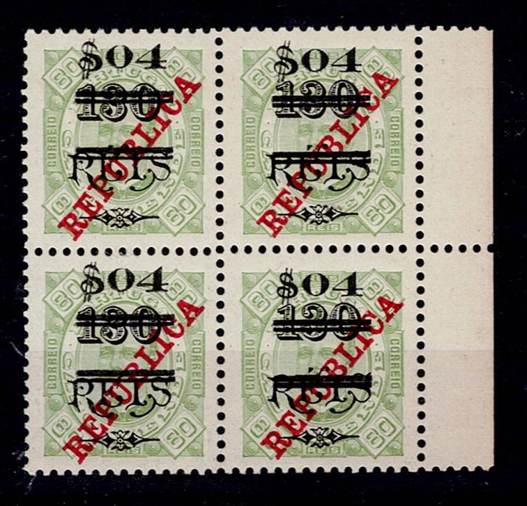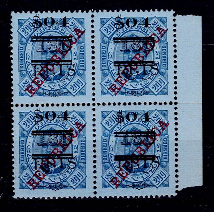 523 imageCape Verde - 1922 - D. Carlos I. with surcharge. BLOCK stamp sheet edge Mf#186+186a of $04 s/ 130 r. s/ 200 reis blue s/ blue, 1 stamp with VARIETY small $. New copies, with original gum without hinge, without defects or repairs, with good color. Catalog value € 52 .(Image 1)
