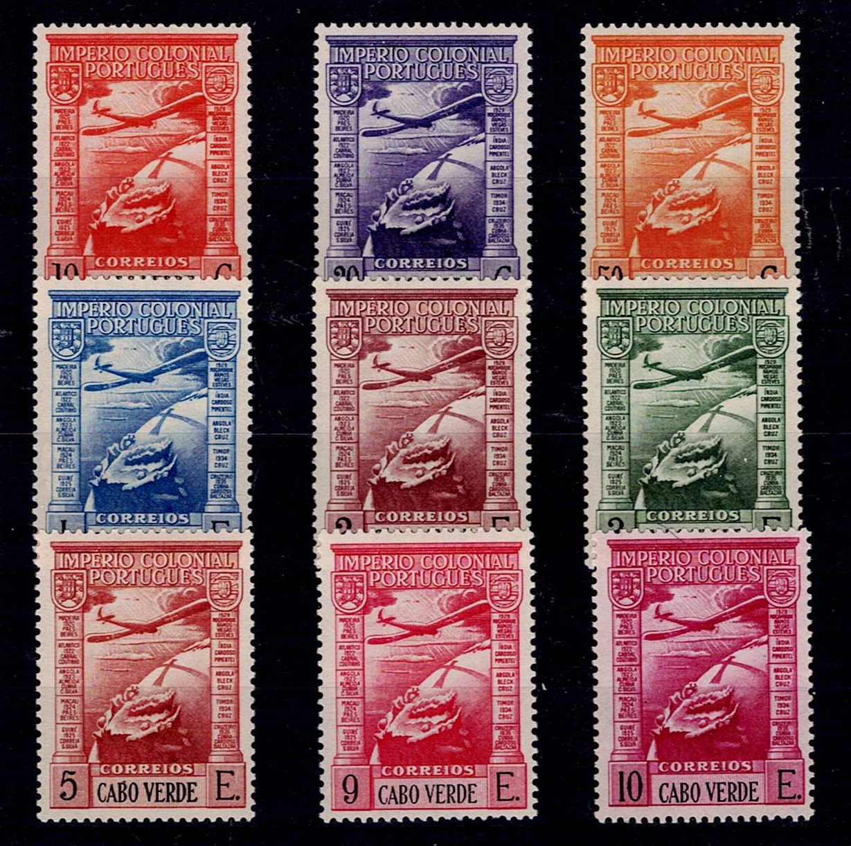 526 imageCape Verde 1938 Portuguese Colonial Empire - Air Mail. Complete series Mf#CA1-9 in new stamps, with gum and hinge, good color, and without repairs. Catalog value €64.(Image 1)