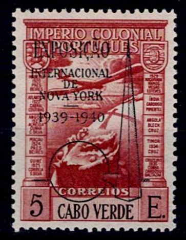 527 imageCape Verde - 1938 – Air Mail - Portuguese Colonial Empire, with overprint “NEW YORK INTERNATIONAL EXPOSITION 1939-1940. Mf#CA7a, 5E, reddish-brown, smooth paper, 13 ½ perforation. New copy, with original gum and hinge, in good color. Catalogue value € 150.(Image 1)