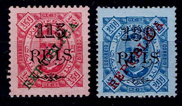 529 imageCape Verde 1913 – D. Carlos I, Diogo Neto type with surcharge and with local overprint in green - ISSUED BUT NOT CIRCULATED. Stamp Mf#NE1+3, 115 s/ 150 reis carmine without pink + 130 s/ 200 reis blue without blue, in perforation 11 3/4. New copies, with gum and hinge, in good color. Catalogue value € 110.(Image 1)