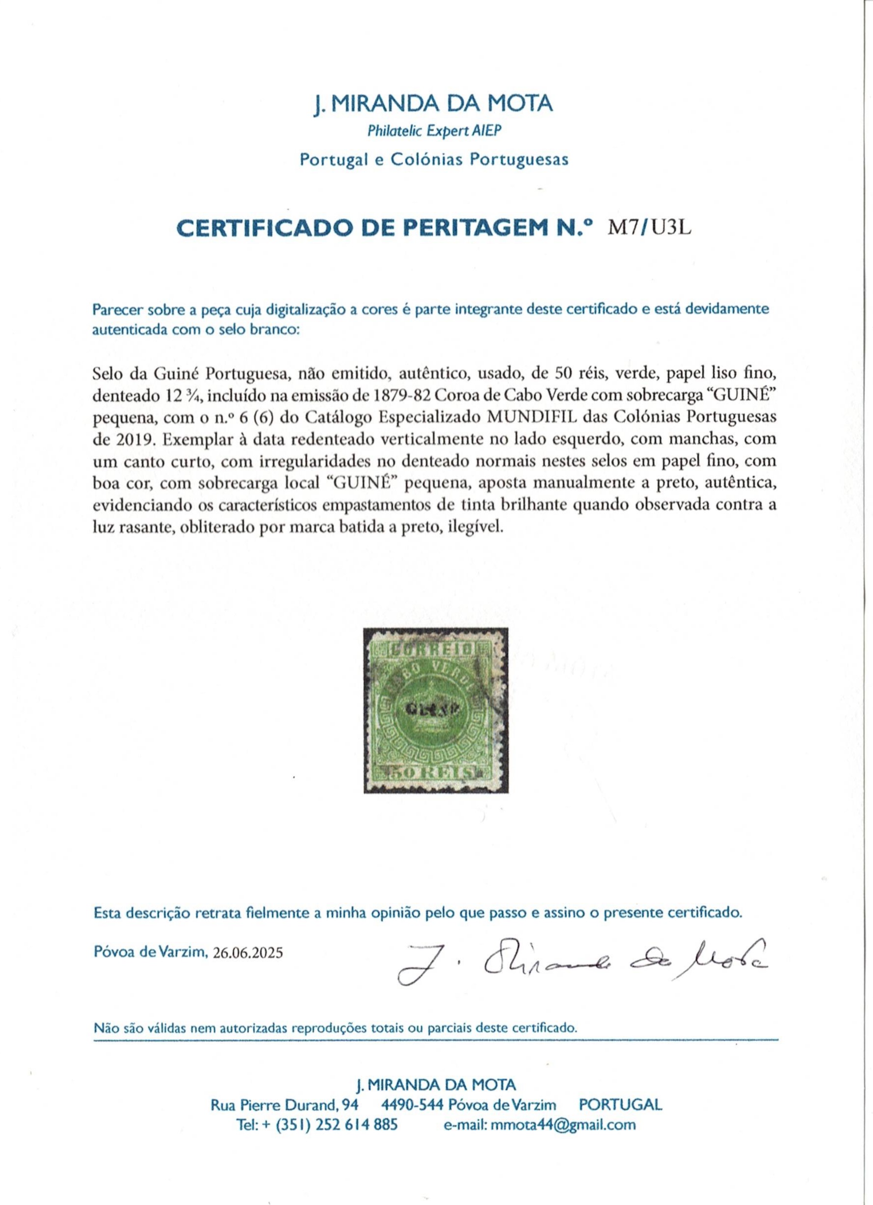 531 imageGuinea 1879-82 – Crown. Stamps of Cape Verde, with small "GUINEA" overprint. NOT ISSUED. Mf#6, 50 reis, green, smooth, thin paper, 12 ¾ perforation. Used copy, reperforated on the left side, with some soiling and one short corner, with irregularities in the perforation normal for this type of stamp, in good color. J. Miranda da Mota certificate. Catalog value €1,600.(Image 1) (Image 2)