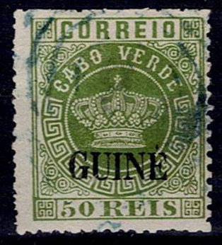 Guinea 1879-84 Crown. Stamp Mf#15a, 50 reis green, smooth paper, 12 3/4 perforation. Used stamp,