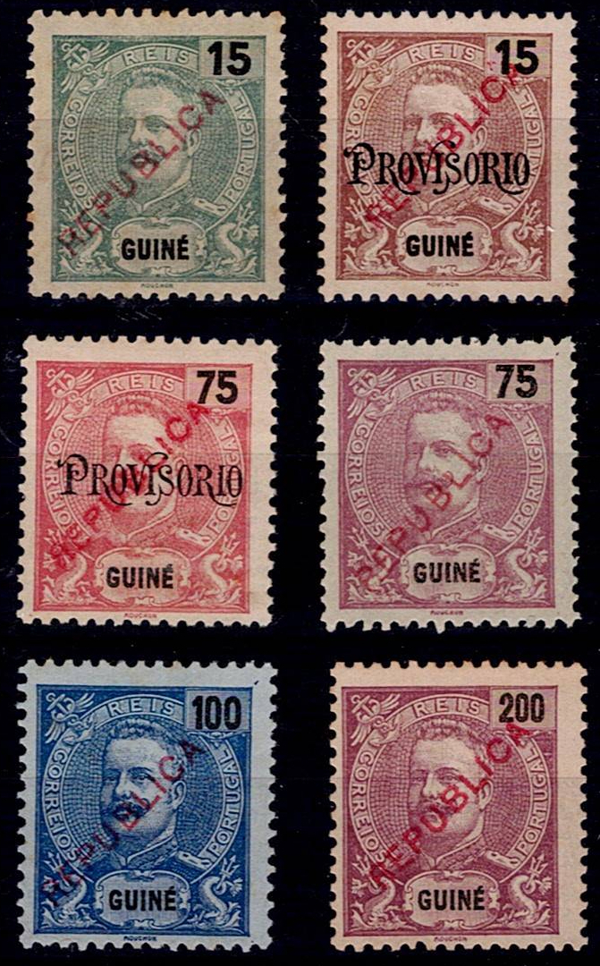Guinea 1913 D. Carlos I Mouchon type with local REPUBLICA overprint. Complete series Mf#137-142, smooth