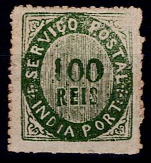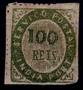 571 imageIndia 1876 Natives type IIB. Stamp Mf#30 of 100 reis, green, type IIB, fine bluish paper, 12.5 to 13.5 line perforation. New copy, with remains of gum and hinge, with traces of oxide and without repairs. Catalog value €350.(Image 1)