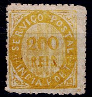 559 imageIndia 1871 Natives Type II. Stamp Mf#12a of 200 reis, yellow, type II, laid paper, perforated 12.5 to 14.5 lines. New copy, ungummed, with a minimal thinning point. Catalog value €390.(Image 1)