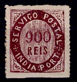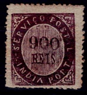 566 imageIndia 1873 Natives, type IA. Stamp Mf#20, 900 réis dark violet, fine bluish paper, issue IA. New copy, with traces of gum and hinge, soiled reverse and unrepaired, in good color. Catalogue value €300.(Image 1)