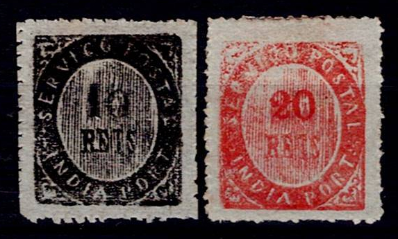 563 imageIndia 1873 – Natives, Type IA and IB. Set of 2 stamps MF#16, 10 reis black (type IA), and Mf#17c, 20 reis orange-red (type IB), perforated 12 1/2 to 14 1/2 lines. New copies, without gum the 10 reis and with gum and hinge the 20 reis, with good colors and no repairs. Catalog value €150.(Image 1)