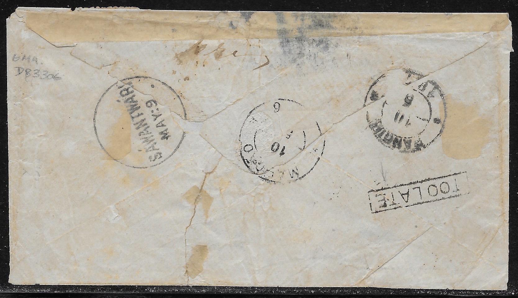 569 imagePort. India 1876 dual franking cover from Bombay to Margao franked with a 20 reis Native Portuguese India issue (CE 28) and a half anna blue British India Queen Victoria issue. “Bombay” CDS ties the Native issue and a barred oval “S W 2” ties the British India stamp. On the back: “Sawantwaree” railway transit CDS, “Panjim” (Nova-Goa) transit CDS, a “Margao” receiving CDS and a boxed “TOO LATE” postmark applied in Bombay. A Portuguese India stamp “used abroad”. Note: the cover has faults and may have been reinforced along the top.(Image 1) (Image 2)