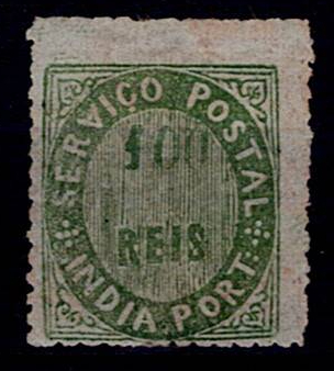 555 imageIndia 1871 Natives Type I. 100 reis stamp, yellow green, type I, fine paper, 13 to 18 line notch, Mf#4. New copy, ungummed, with 2 short margins. Catalogue value €900.(Image 1)
