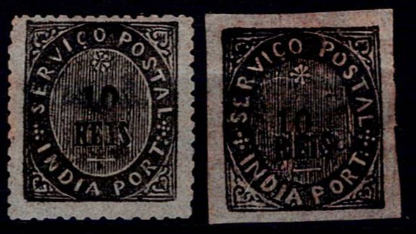 572 imageIndia 1877 Natives, Type III and IIIA. Complete series of 2 stamps Mf#37+38, 10 reis black, bluish and perforated paper, 12.5 to 13.5 lines. New copies, #37 without gum and with traces of gum and hinges, and soiled #38, both with good color. Catalogue value €163.(Image 1)