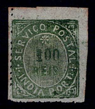 India 1877 Natives, type III B. Stamp Mf#43, 100 reis green, bluish and serrated paper 12.5 to 13.5