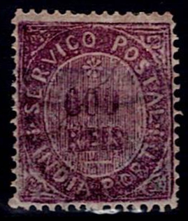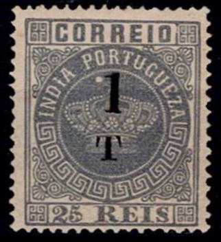 India 1881-83 Crown with surcharge. Stamp Mf#87a, 1 Tg s/ 25 reis slate, perforation 13.5. New copy,