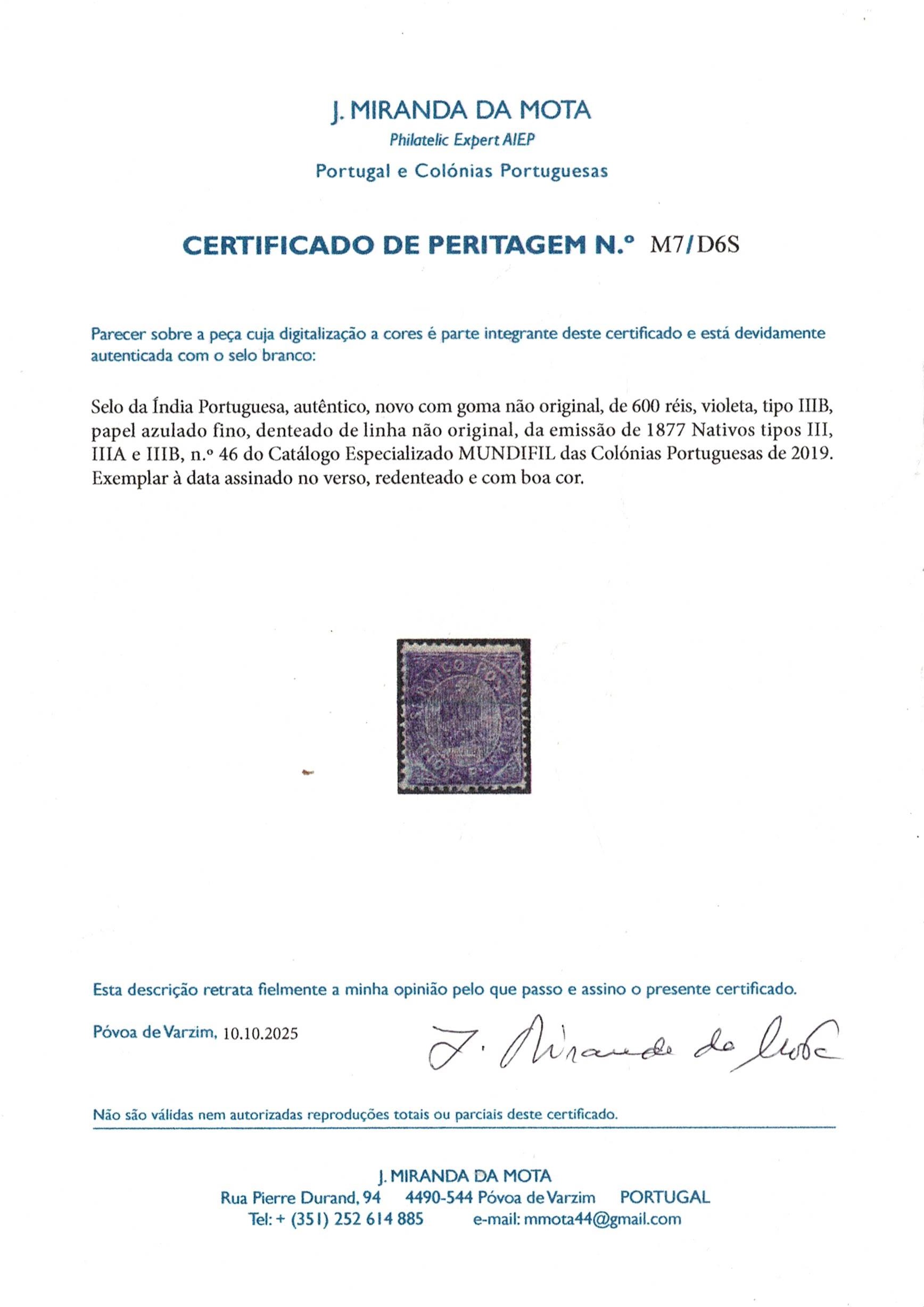 India 1877 Natives, type III B. Stamp Mf#46, 600 reis violet, bluish and perforated paper 12.5 to 13.5