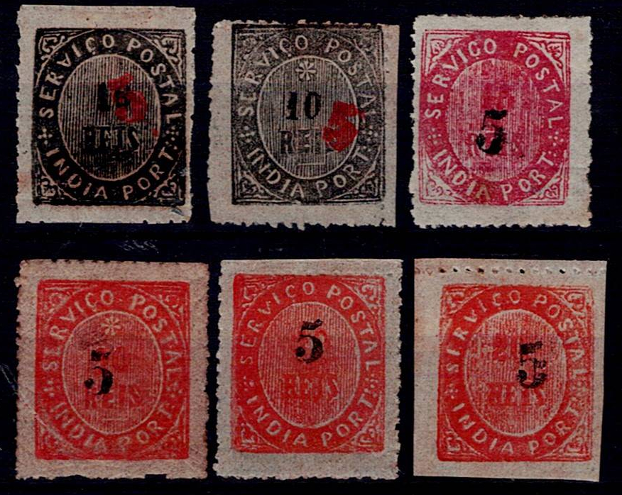 India 1881 – Natives, with surcharge. Lot with 6 stamps Mf#62 (x2: ID+IIIB), 5 r. s/ 10 reis, black +