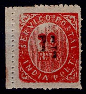 India 1881 – Natives, with surcharge. Values in local currency. Stamp Mf#65d, 1 1/2 s/20 reis,
