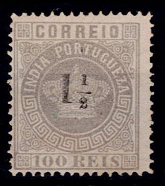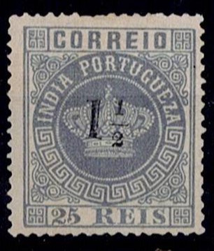 India 1881-83 Crown with surcharge. Stamp Mf#69a, 1.5 s/ 25 reis slate, perforation 13.5. New copy,