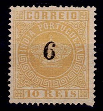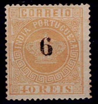 India 1881-83 Crown with surcharge. Stamp Mf#82, 6 s/ 40 reis yellow, perforation 13.5. New copy,