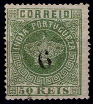India 1881-83 Crown with surcharge. Stamp Mf#83a, 6 s/ 50 reis green, perforation 13.5. New copy,