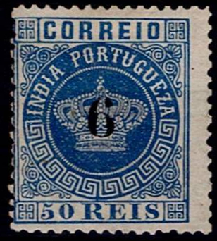 India 1881-83 Crown with surcharge. Stamp Mf#84, 6 s/ 50 reis blue, perforation 12 3/4. New copy,