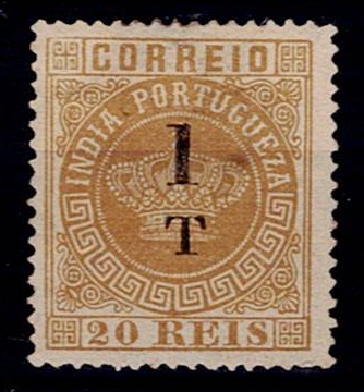 India 1881-83 Crown with surcharge. Stamp Mf#86a, 1 Tg s/ 20 reis bistre, perforation 13.5. New copy