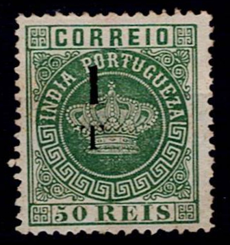 India 1881-83 Crown with surcharge. Stamp Mf#90, 1 Tg s/ 50 reis green blue, perforation 12 3/4. New