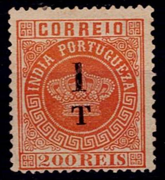 India 1881-83 Crown with surcharge. Stamp Mf#93a, 1 Tg s/ 200 reis orange, perforation 13.5. New copy