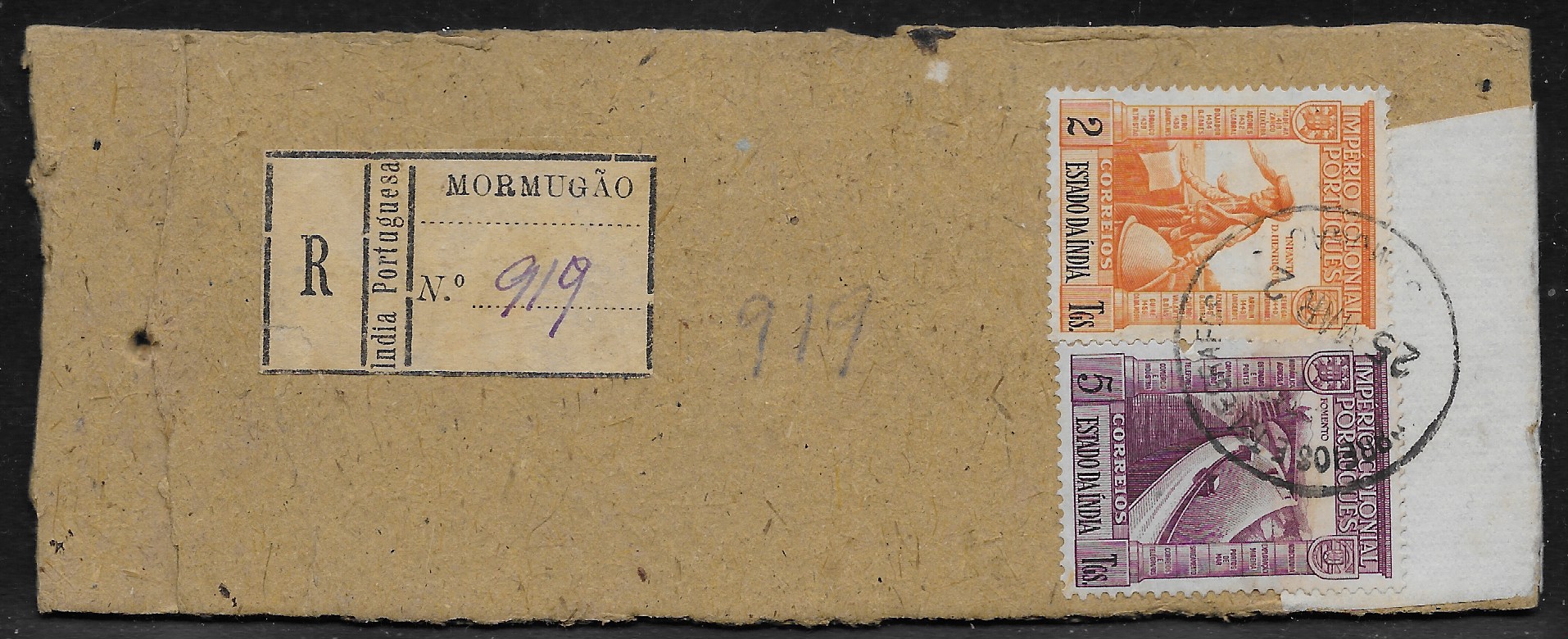 with 2 Imperio issues: 2 tangas (CE 355) and 5 tangas (CE 358). “Mormugao” CDS ties the stamps. Mormugao registration label. Bombay “DHC/23” censor mark. Light violet oval “R”. The left side is bent. A very interesting and unusual item. Very