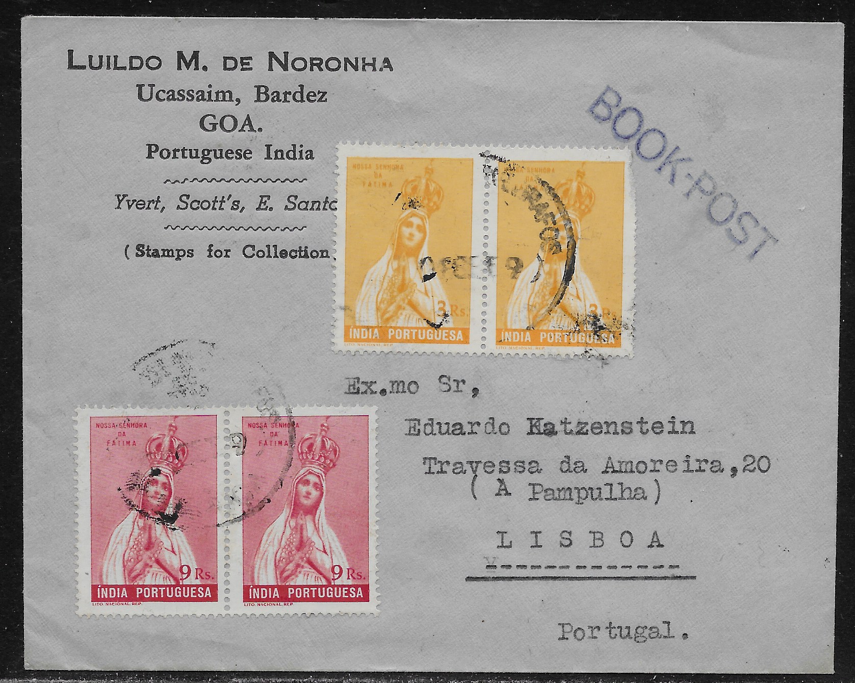 Port. India 1949 book post (printed matter) cover from Ucassaim Goa to Lisbon franked with 2 pairs of