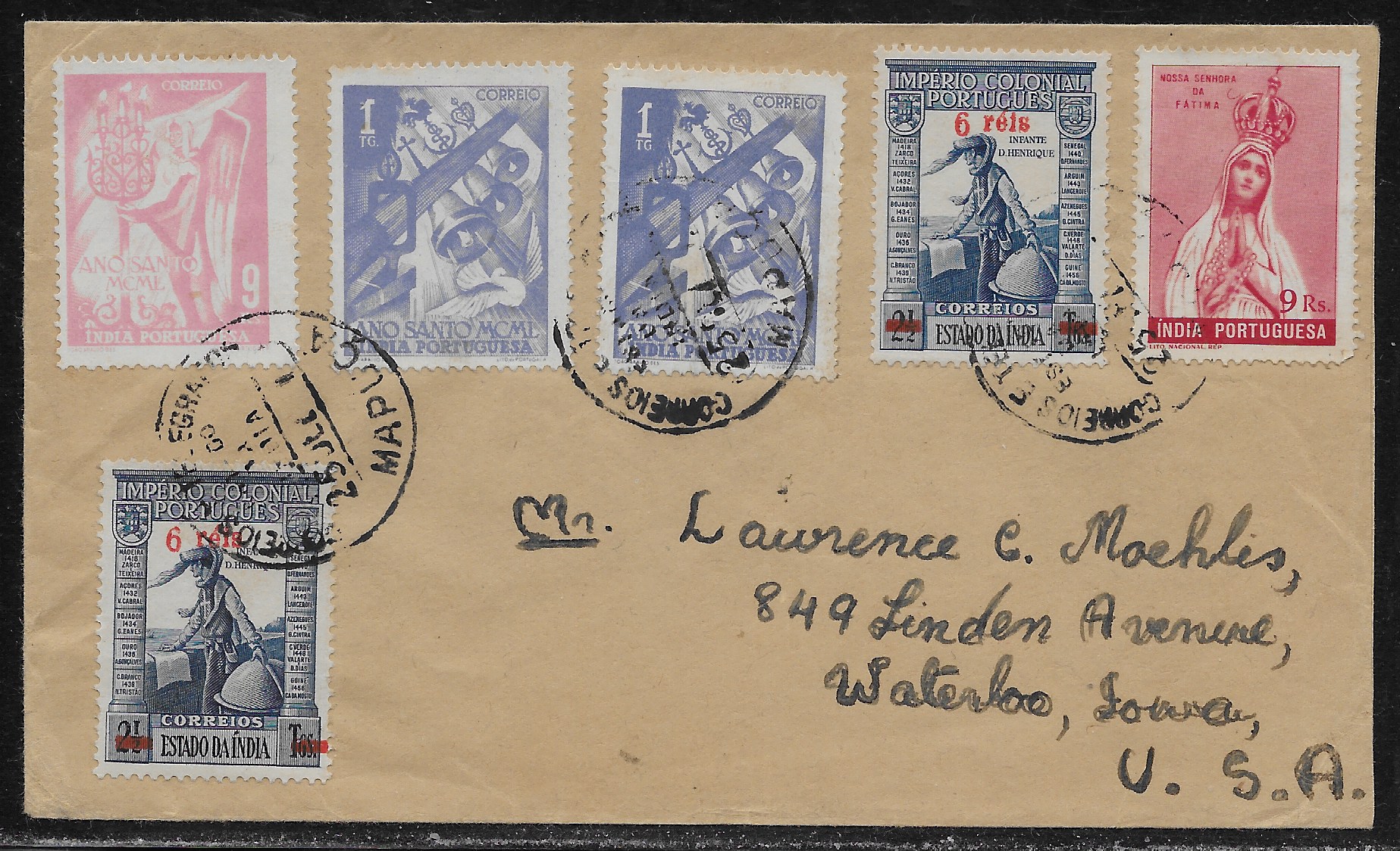 Port. India 1951 surface rated cover from Mapuca to Waterloo Iowa franked with two overprinted 6 reis
