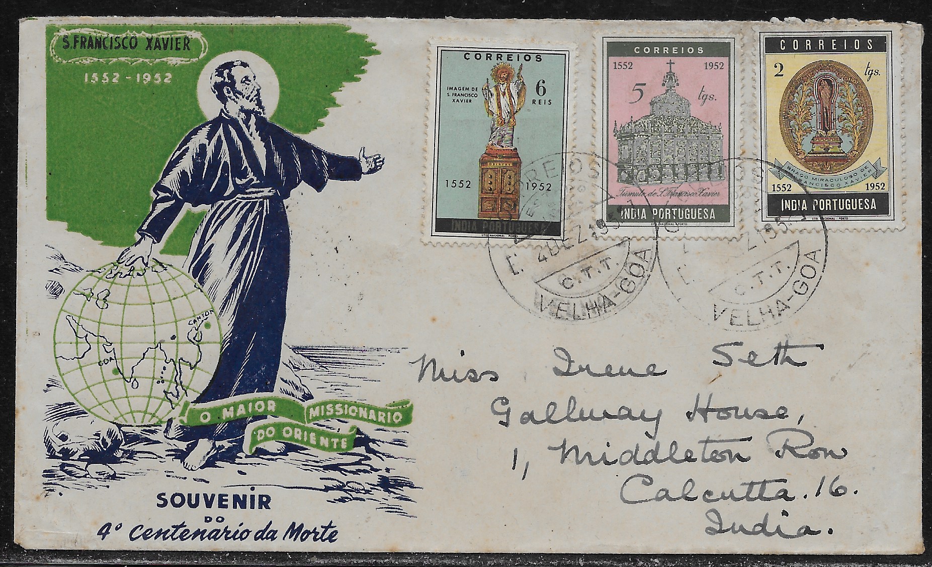 426), 2 tangas (CE 427) and 5 tangas (CE 428). All stamps tied by a scarce “Velha- Goa” CDS. The stamps are mounted on a souvenir St. Francis envelope in green. “Park Street - Calcutta” arrival CDS on the back. Inside the envelope are two items. A