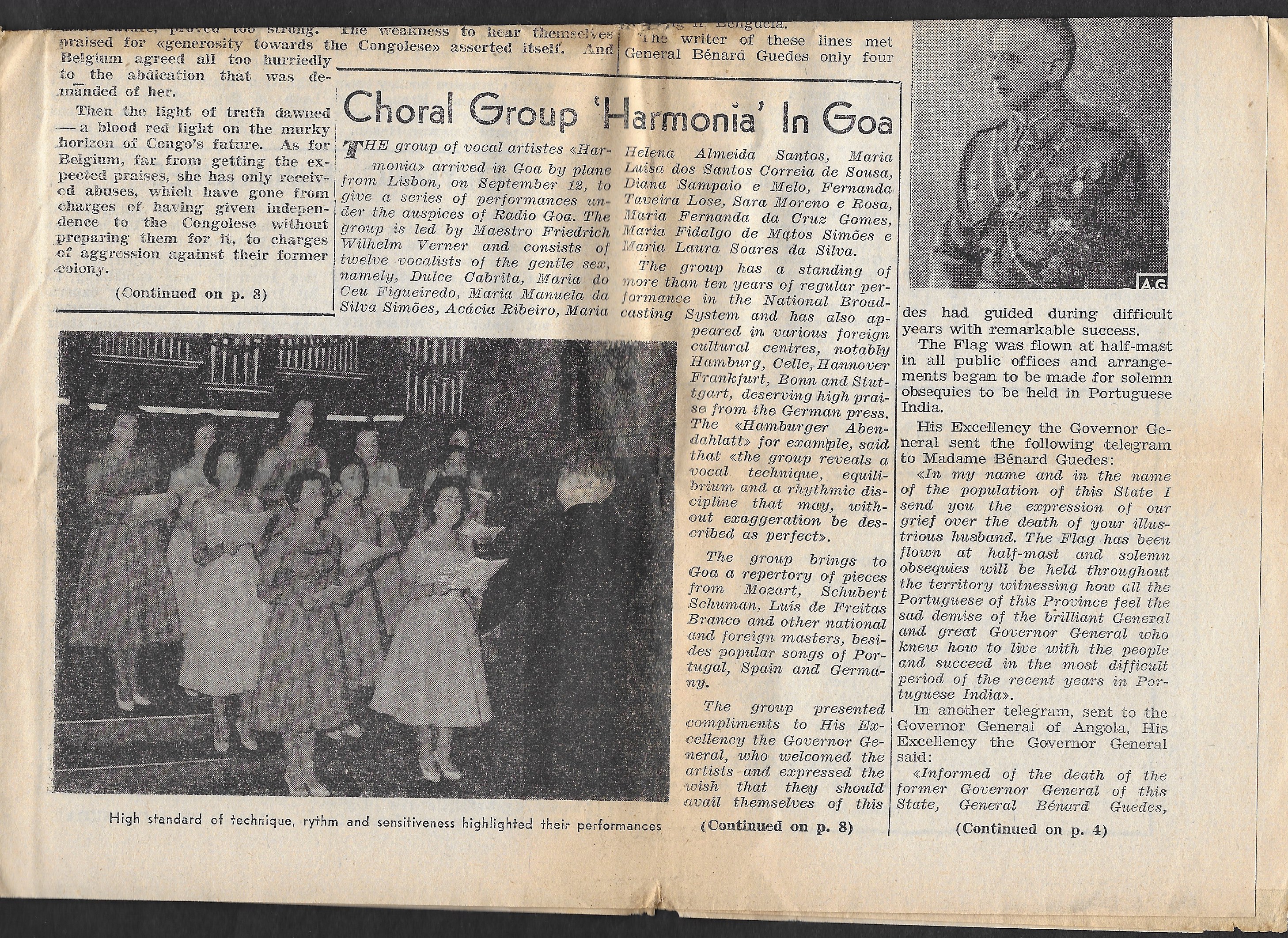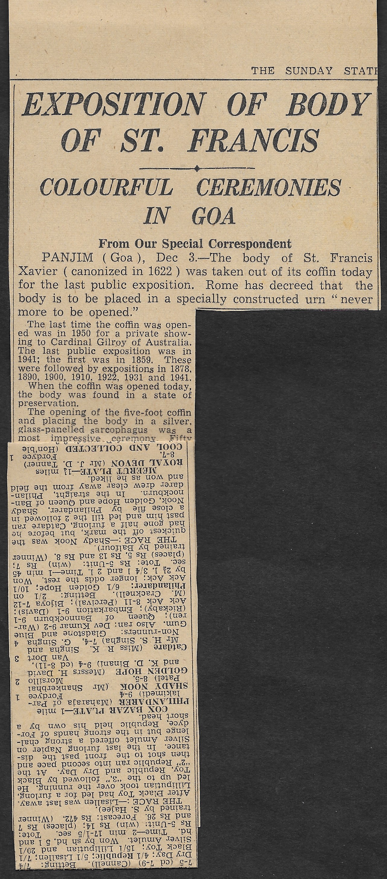 newspaper clipping from “The Sunday Statesman” newspaper of Calcutta, dated December 7th, 1952, describing the festivities of St. Francis in Goa called “Colourful Ceremonies on Goa”. Also included is a small card depicting St. Francis surrounded by
