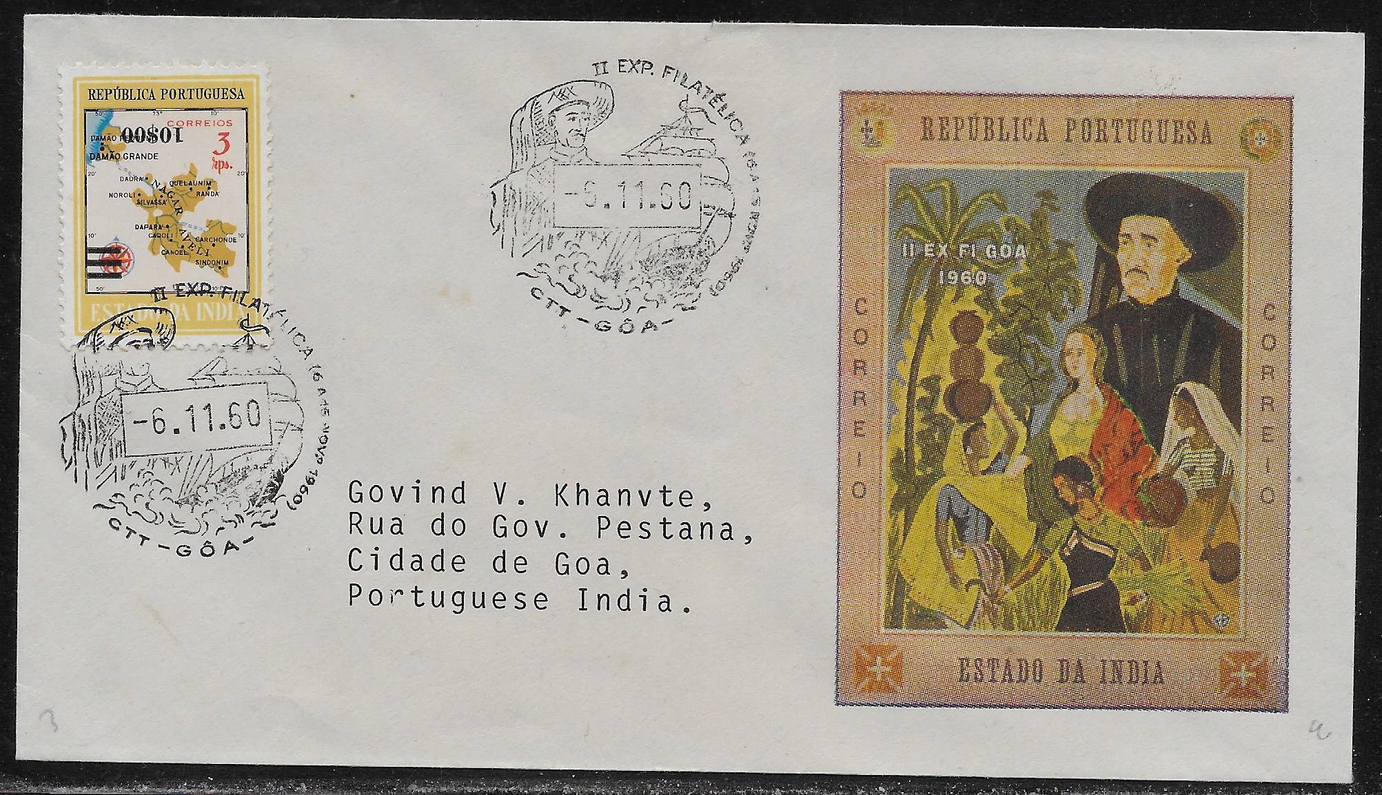 10 escudos on 3 rupias “map” issue (CE 488) with an INVERTED OVERPRINT. The exhibition postmark, tying the stamp, is dated “-5.11.60”. An attractive cachet on the right. Very unusual. Tear top and back flap.(Image 1)