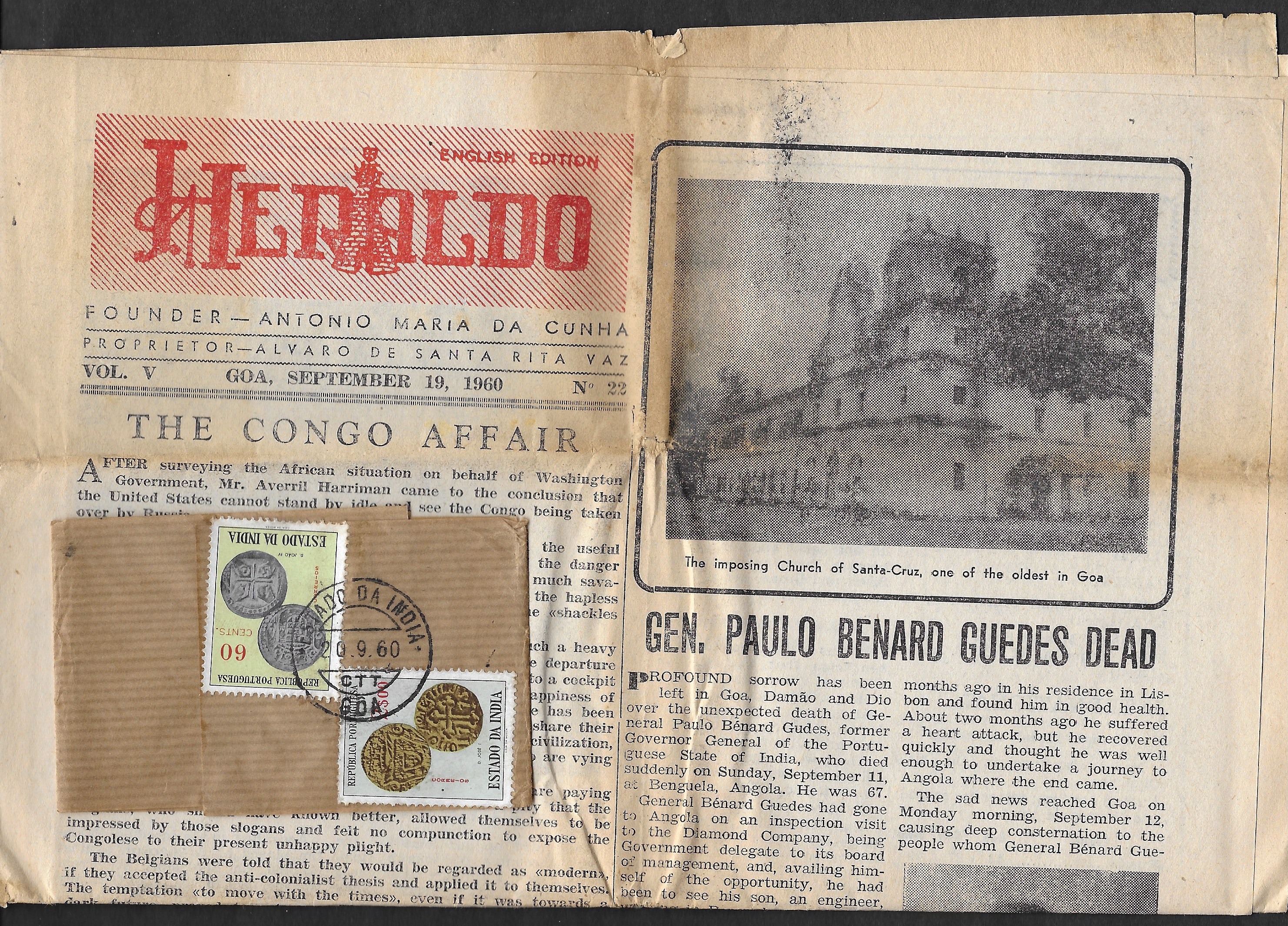 franked on the wrapper with 2 coin stamps: 60 centavos (CE 511) and 2 escudos (CE 515). The wrapper has been removed and the newspaper has been opened out. Contents involve colonial events. The newspaper is dated September 19th, 1960 and the “Goa”