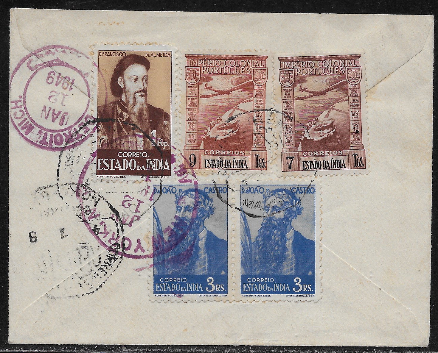Port. India 1949 registered cover from Margao to Detroit Michigan franked on the back with 2 Imperio