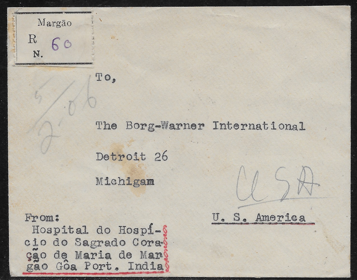 CDS. “Margao” registration label on the front. Interesting combination of stamps.(Image 1)