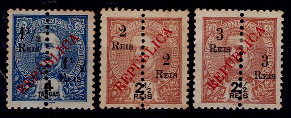India 1914 – D. Luís I, straight ribbon, perforated in the middle, with surcharge and overprint
