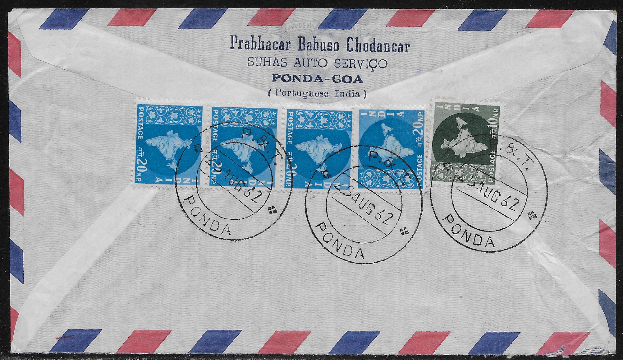 with 5 Union of India “map” stamps: a single 10 np and four 20 np issues. All the stamps are tied by a “Ponda” double circle CDS dated “25 AUG 62”. Portuguese India was annexed the previous year and this is an example of the new Goan postmarks. Note