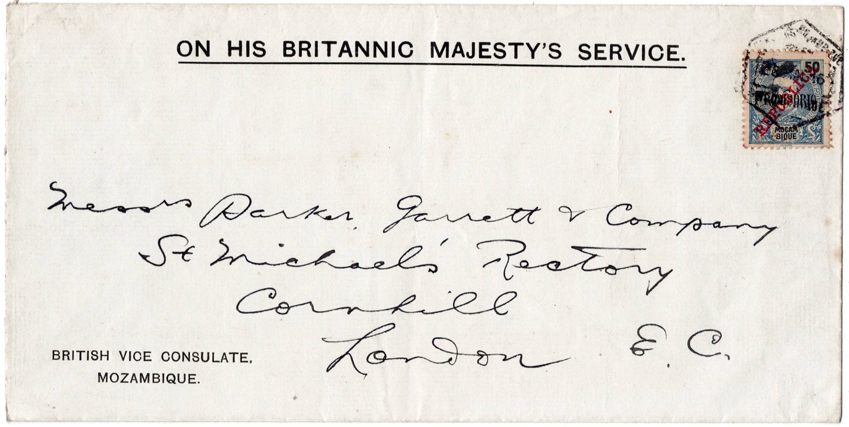 Mozambique. Letter sent by the British Vice-Consulate in Mozambique, on 26.?.1916 to London, Postage of