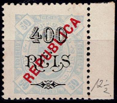 50 reis light blue, dotted paper, 12 3/4 notch (1920). New stamp on the edge of the sheet, ungummed with traces of oxide. Catalogue value €200.(Image 1)