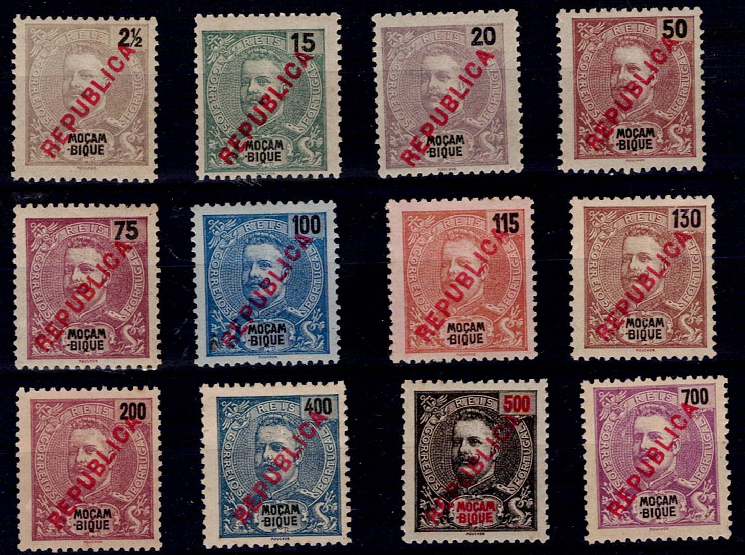 Mozambique 1915-20 D. Carlos I, Mouchon, with local REPUBLICA overprint. Complete series Mf#189-200,