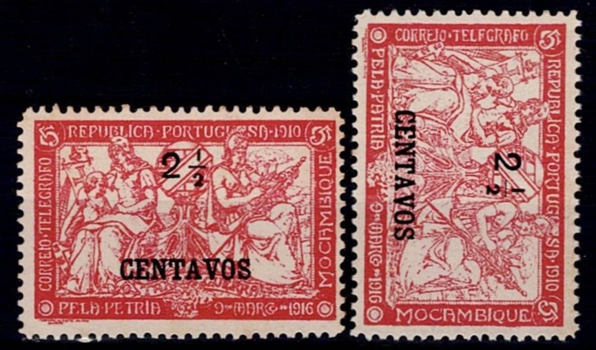Mozambique 1918-20 War Tax, Postal and Telegraph Tax Stamps with surcharge. 2 stamps Mf#204b+204d, with