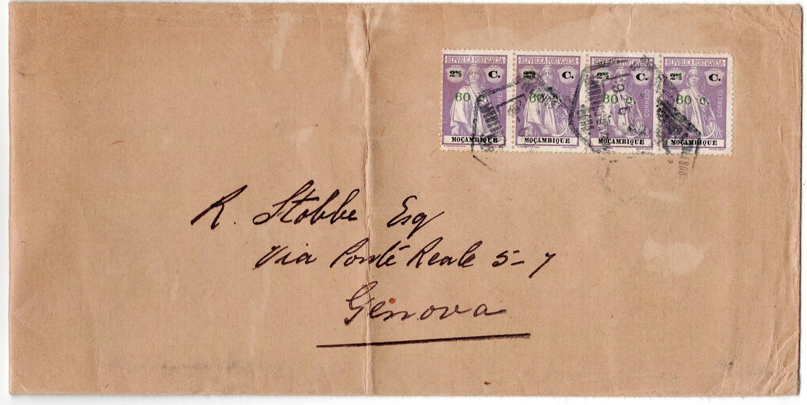 Mozambique. Letter sent from L. Marques Gare, on 9.6.??, to Genoa, postage of 2$40 (strip of 4 stamps