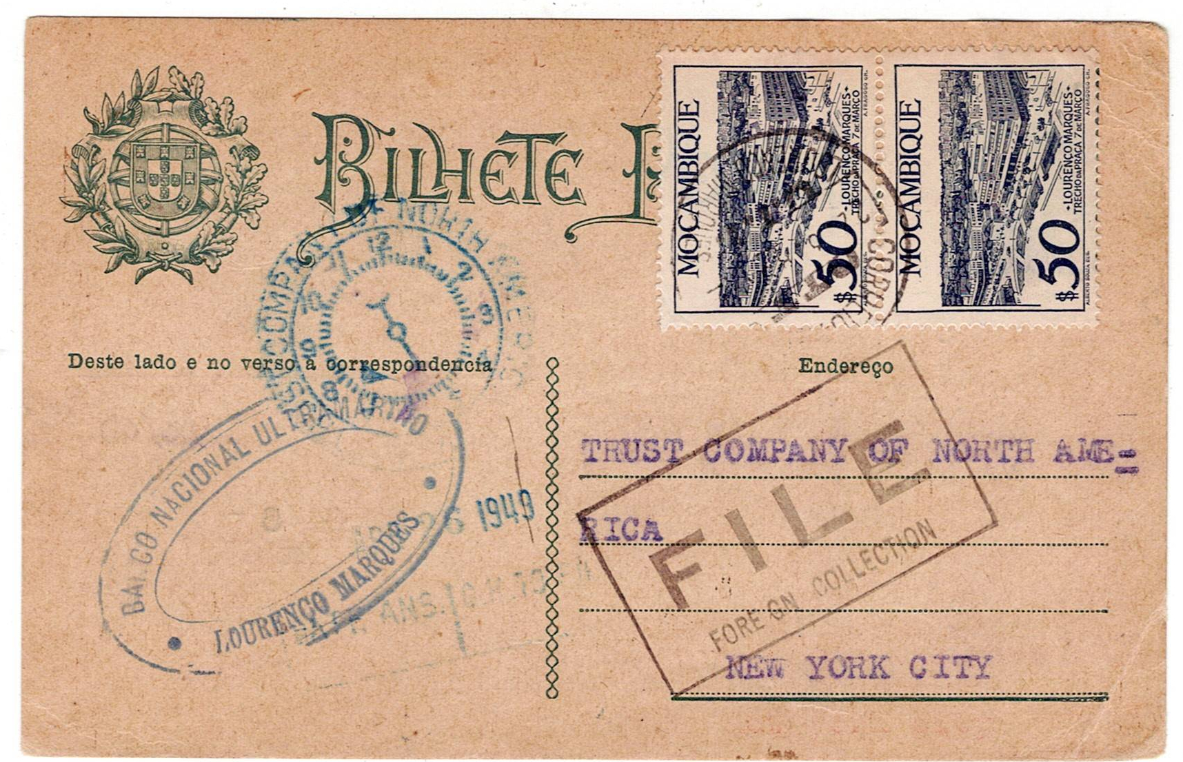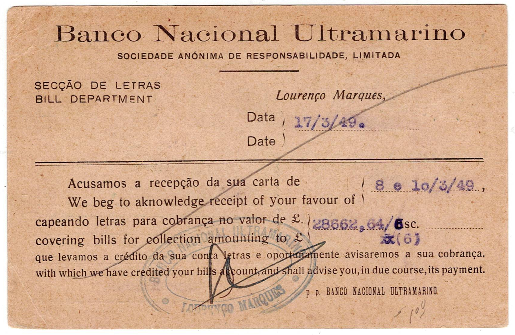 of $50 cents Lourenço Marques), stamped on the back “Banco Nacional Ultramarino”, for N. York 26.4.(Image 1)